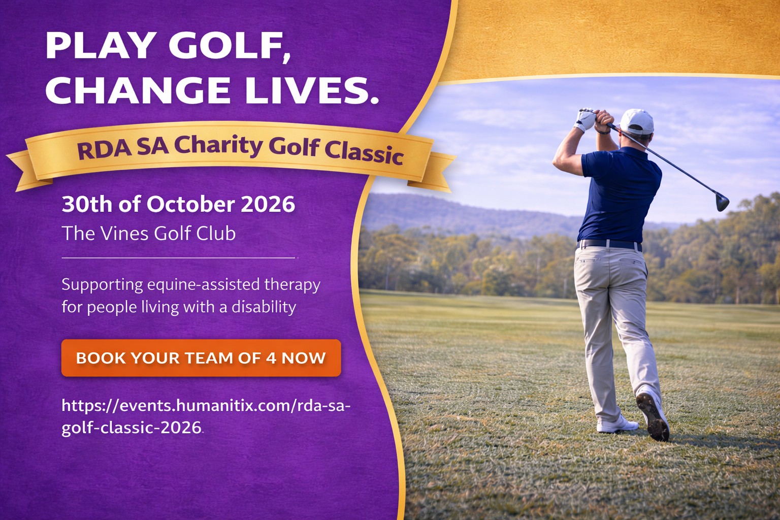 Come and enjoy a great day out on the green helping support RDASA. The inaugural RDA SA Golf Classic will be held on October 30th at The Vines Golf Club of Reynella.